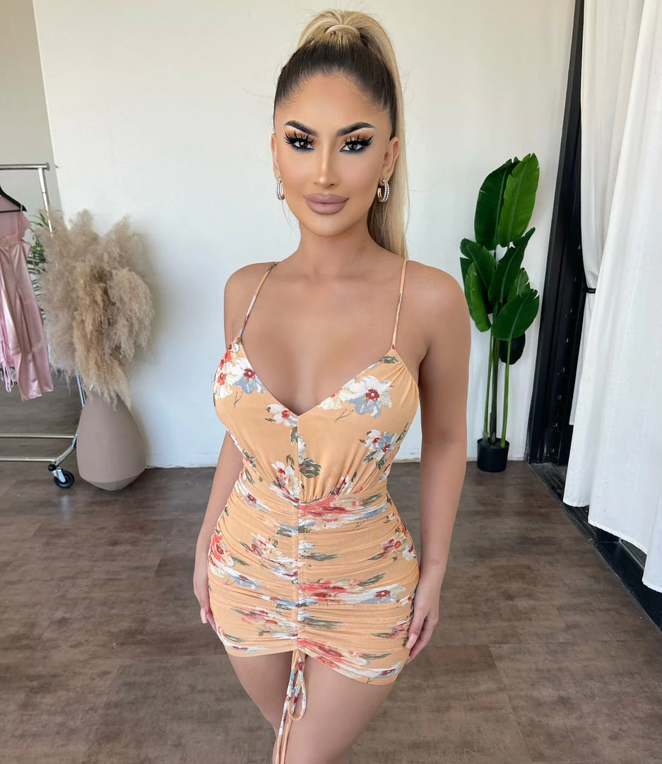 ~Dress made from floral print material with adjustable front scrunch detail, Dress goes great with many heels and perfect for a nice day outÂ