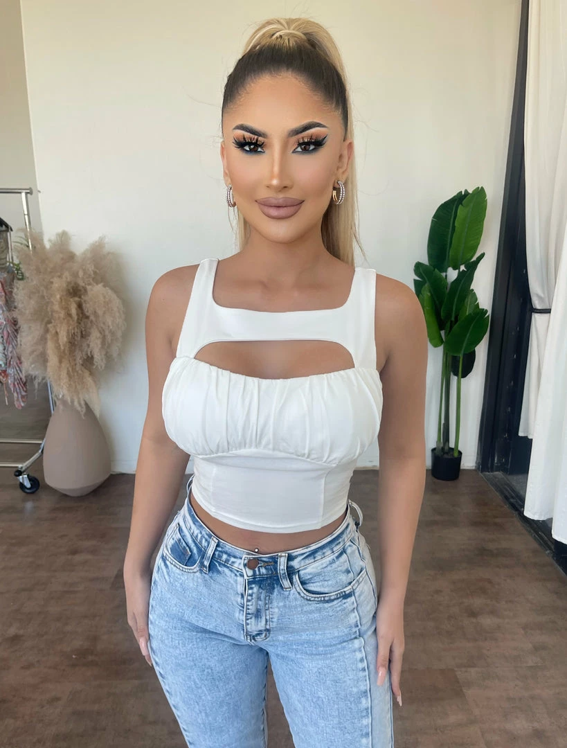 ~Top made from fitted material with open front chest detail, Top goes great with high rise bottoms and perfect with heels or sneakers
