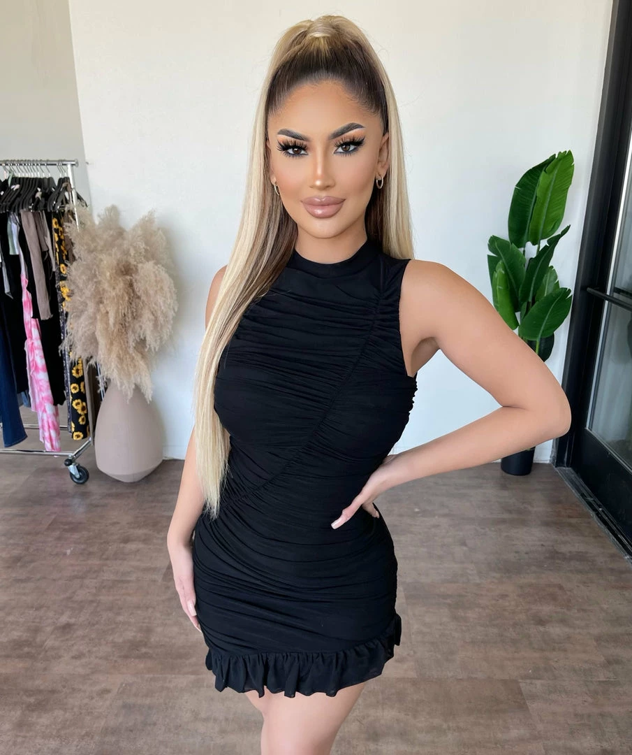 ~Dress made from nice fitted material with ruffle detail on bottom end of dress, Dress is perfect with a distressed cropped jacket and great with heelsÂ