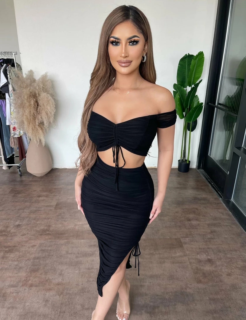 ~Set made from fitted material with off shoulder top and skirt for bottom, Set had adjustable scrunch detail on top and side of skirtÂ