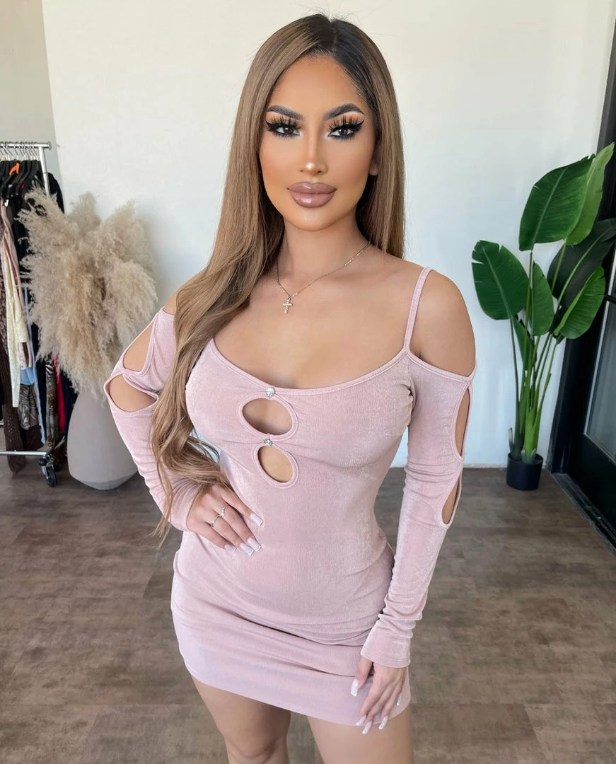~Dress made from fitted semi stretchy material with faux front rhinestone detail, Dress goes great with a cropped denim jacket and many high heelsÂ
