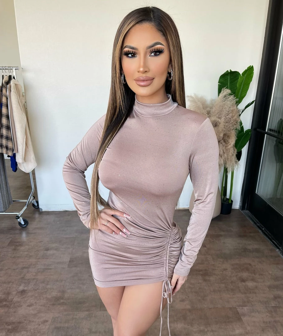 ~Long sleeve dress made from nice fitted material with sparkle detail, Dress has an adjustable side scrunch detail on left bottom side of dress
