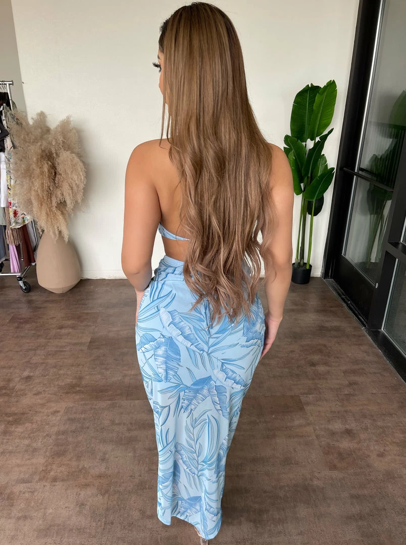 ~Matching set made from printed leaf material with halter top and skirt for bottoms, Matching set goes great with a cropped jacket and perfect for a nice night out