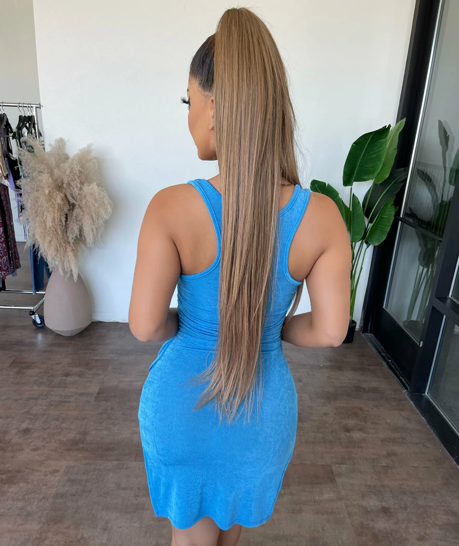 ~Dress made from nice soft material with faux side scrunch detail, Dress goes great with heels and a cropped denim jacket