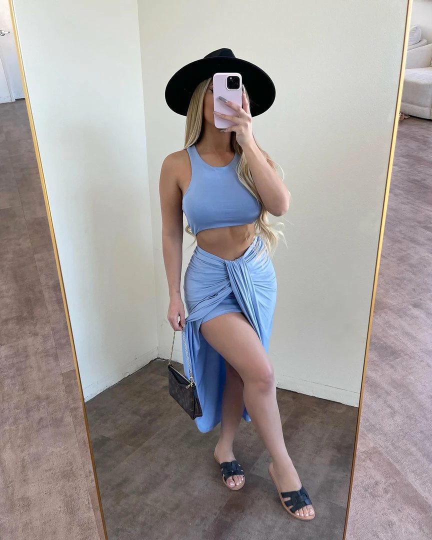 ~Matching set made from soft fitted material with sleeveless top and skirt for bottoms, Set goes great with many heels and perfect with a crop jacket