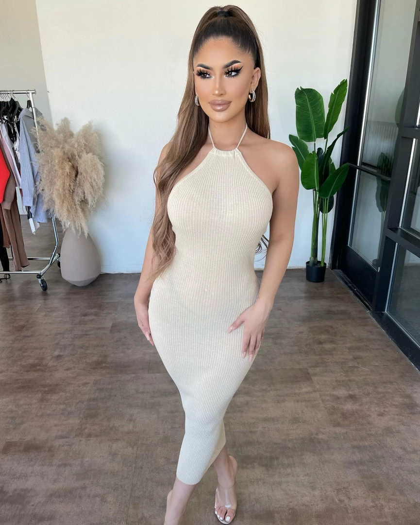 ~Dress made from ribbed material with adjustable back tie detail, Dress goes great with heels and perfect for a nice day out, DRESS IS A LITTLE BIT SEE THROUGH