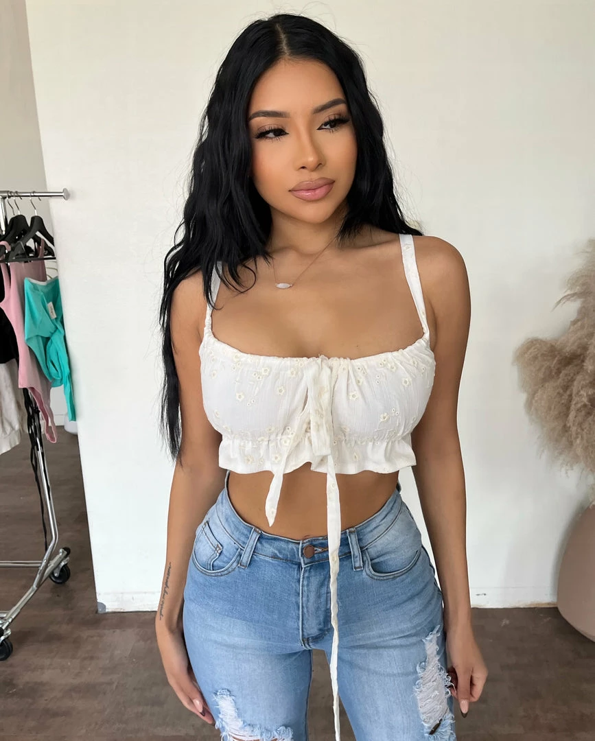 ~Tank top made from floral embroidered print material with adjustable back scrunch detail, Top goes great with high rise denim bottoms and is perfect for many occasions