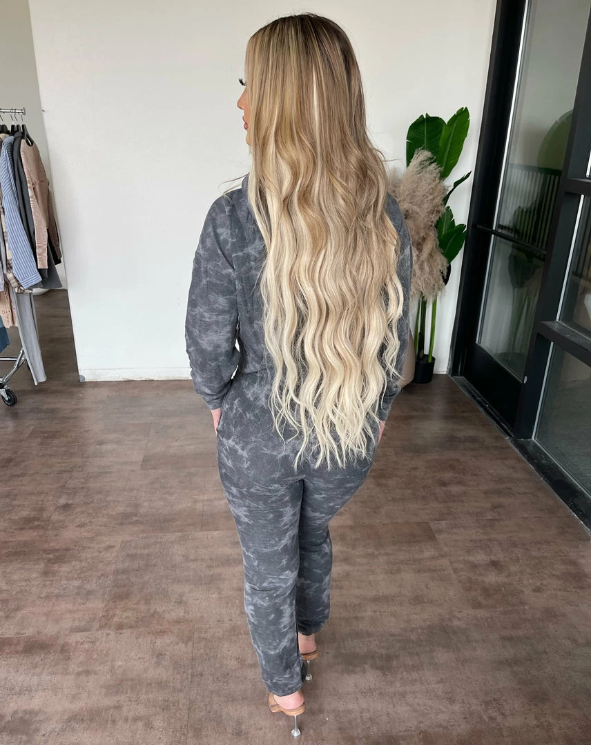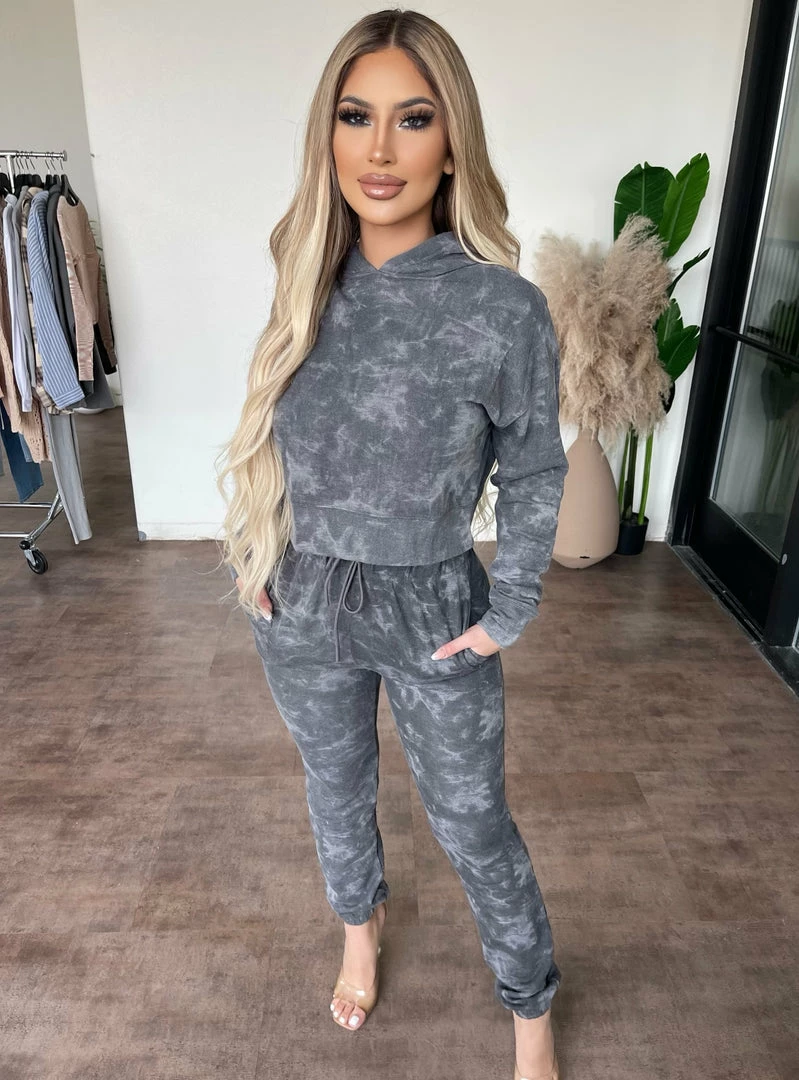 ~Set made from nice charcoal print material with hoodie and pants for bottoms, Set goes great with sneakers or heels and perfect for many occasions