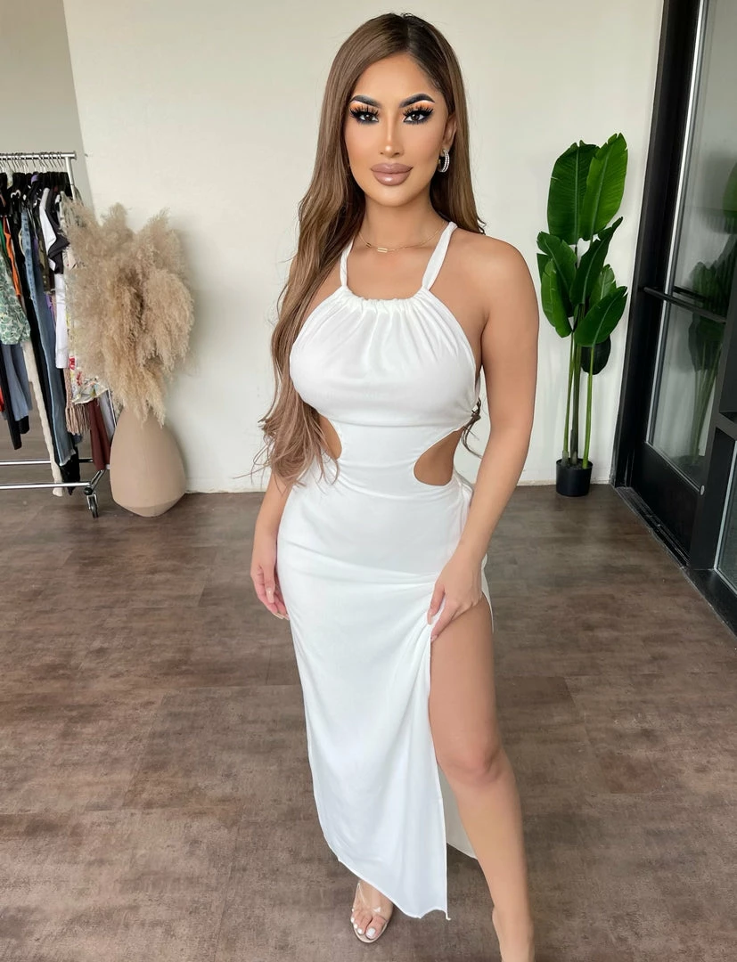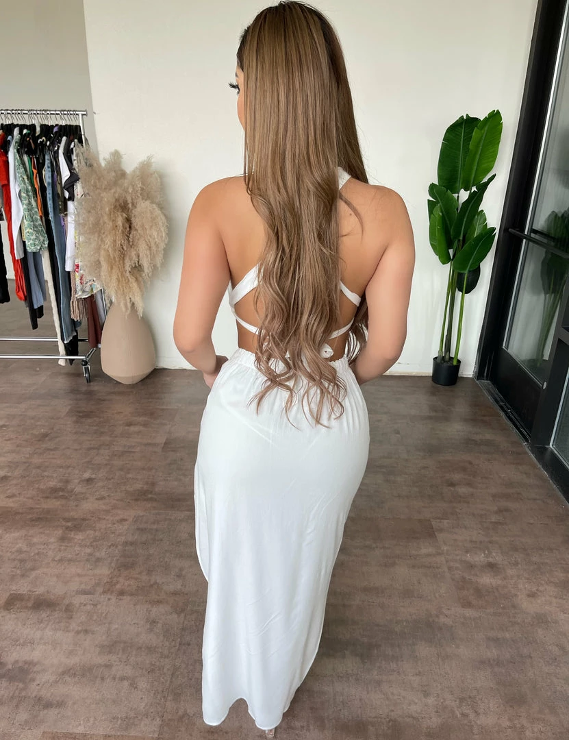 ~Dress made from nice material with open back detail, Dress has nice high slit on left side of dress and is great for a nice special occasion
