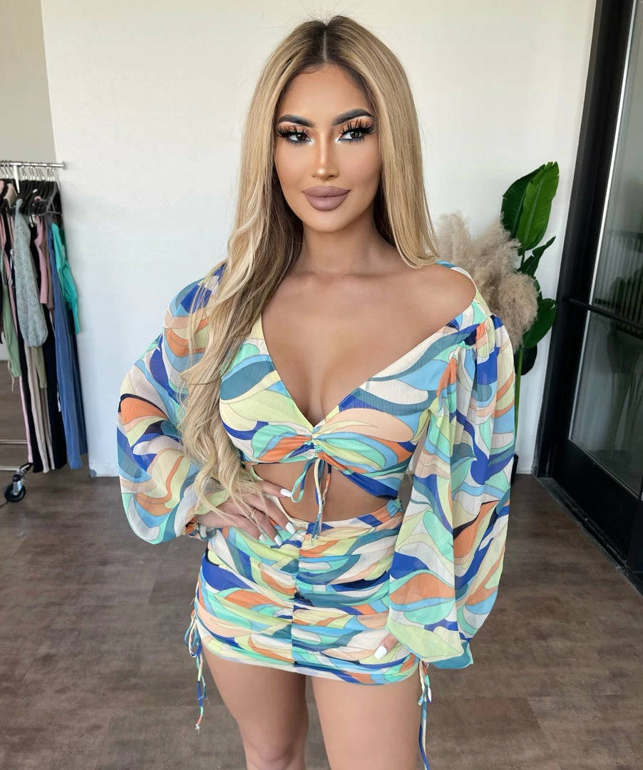 ~Dress made from nice printed material with open front stomach detail and open back detail, Dress has adjustable scrunch detail on front and side of dress