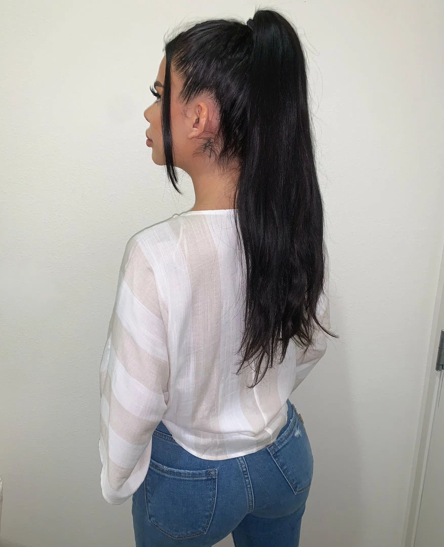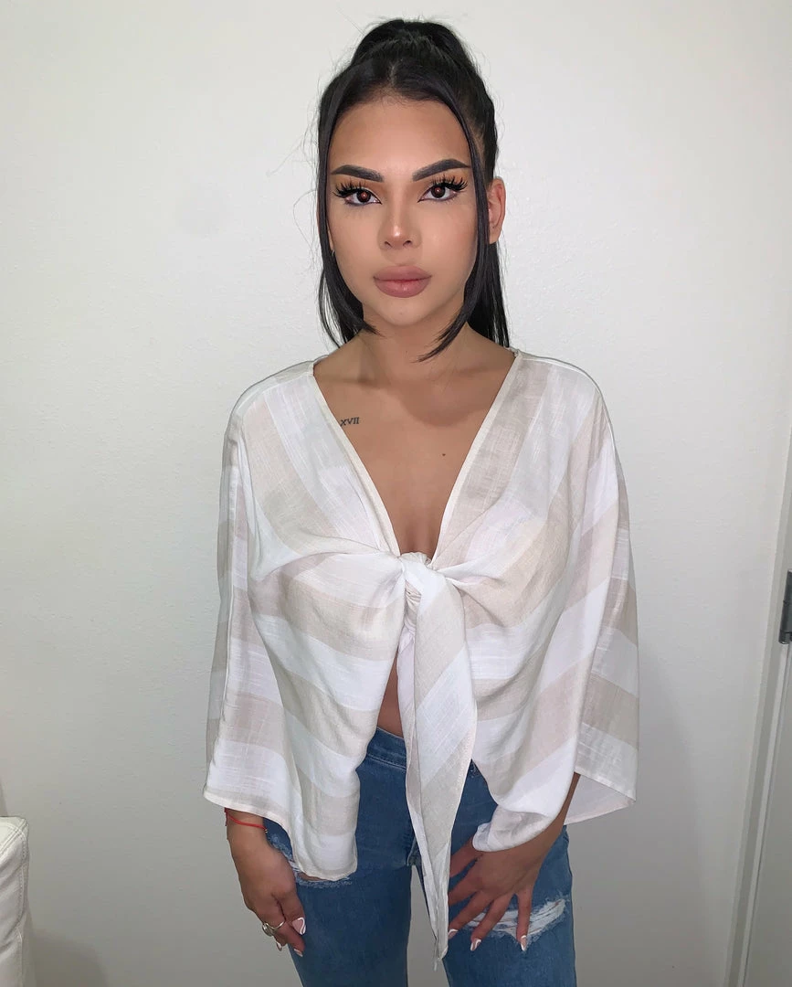 ~Quarter sleeve top made from nice stripe material with adjustable front knot detail, Top is great with high rise denim jeans and perfect with heels