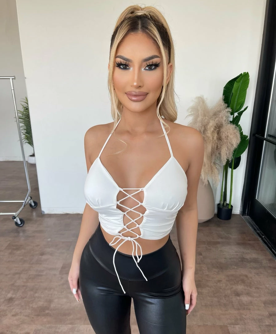 ~Top made from nice fitted material with adjustable front criss cross detail, Top goes great with high rise leather pants and perfect for a nice night outÂ