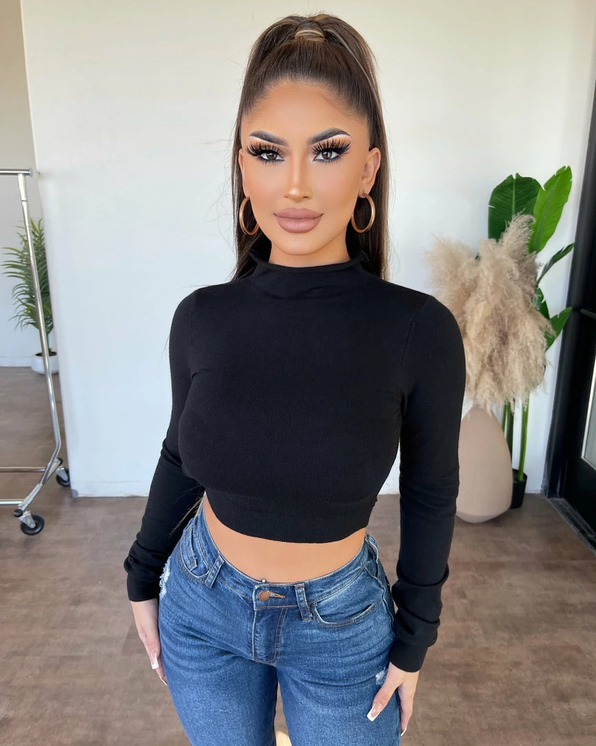~Long sleeve top with nice open back detail and has adjustable back tie detail, Top goes perfect with distressed denim bottoms and is great for a night out.