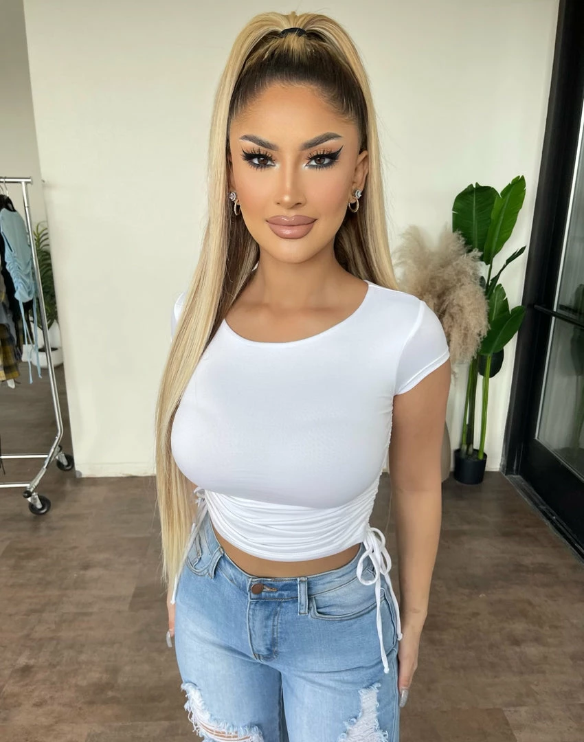 ~Top made from nice soft material with adjustable side scrunch detail, Top goes great with many high rise bottoms and perfect for a nice day outÂ