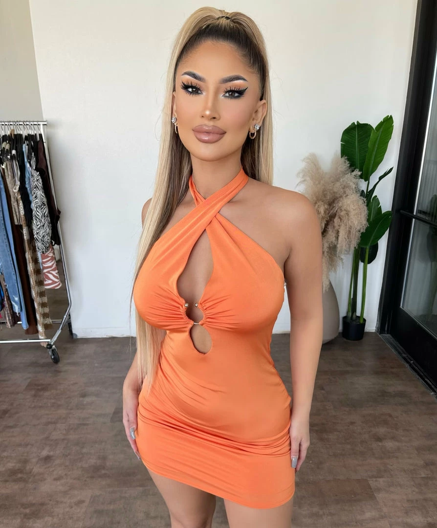 ~Dress made from fitted material with front chest ring detail, Dress also has nice open front stomach detail and goes great with heels
