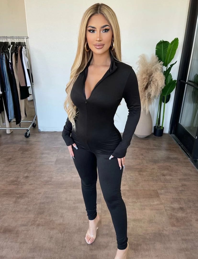 ~Long sleeve jumpsuit made from nice fitted material with adjustable front zipper detail, Jumpsuit goes great with heels or sneakers