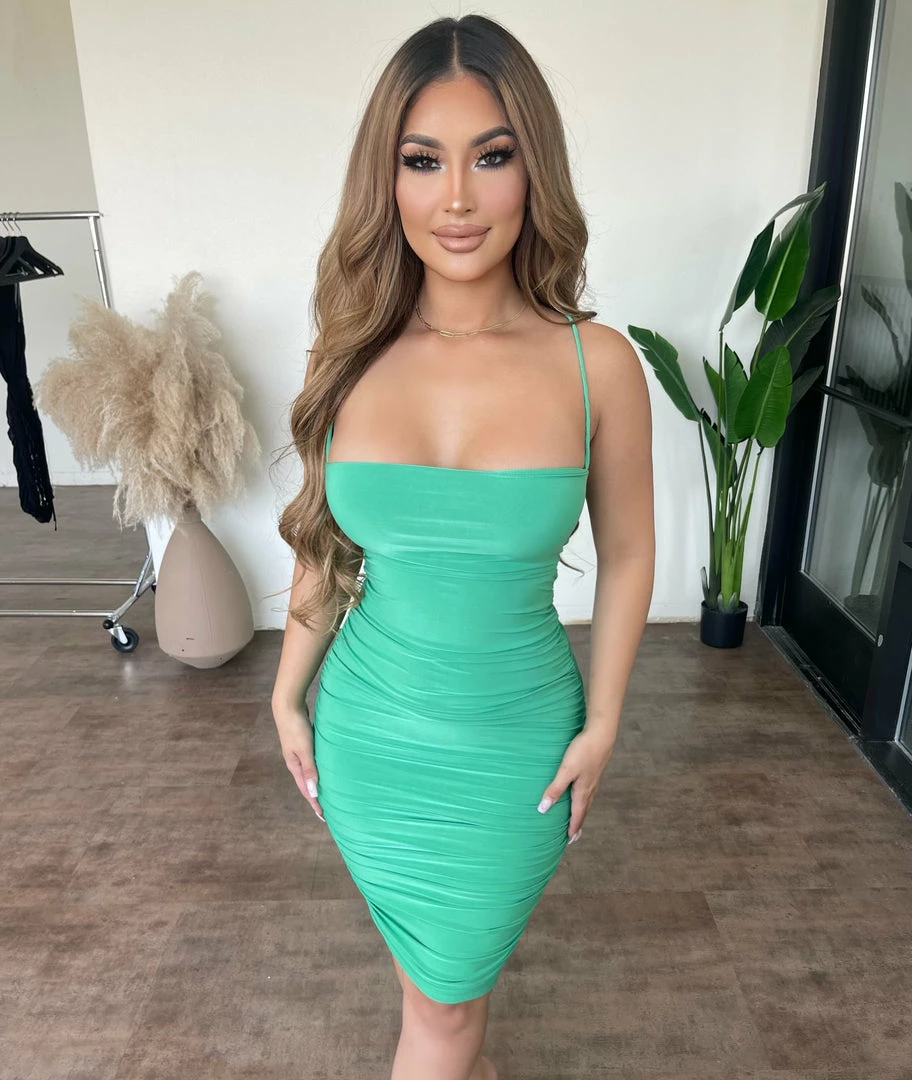 Beautiful sleeveless open back crisscross ruched midi dress.
