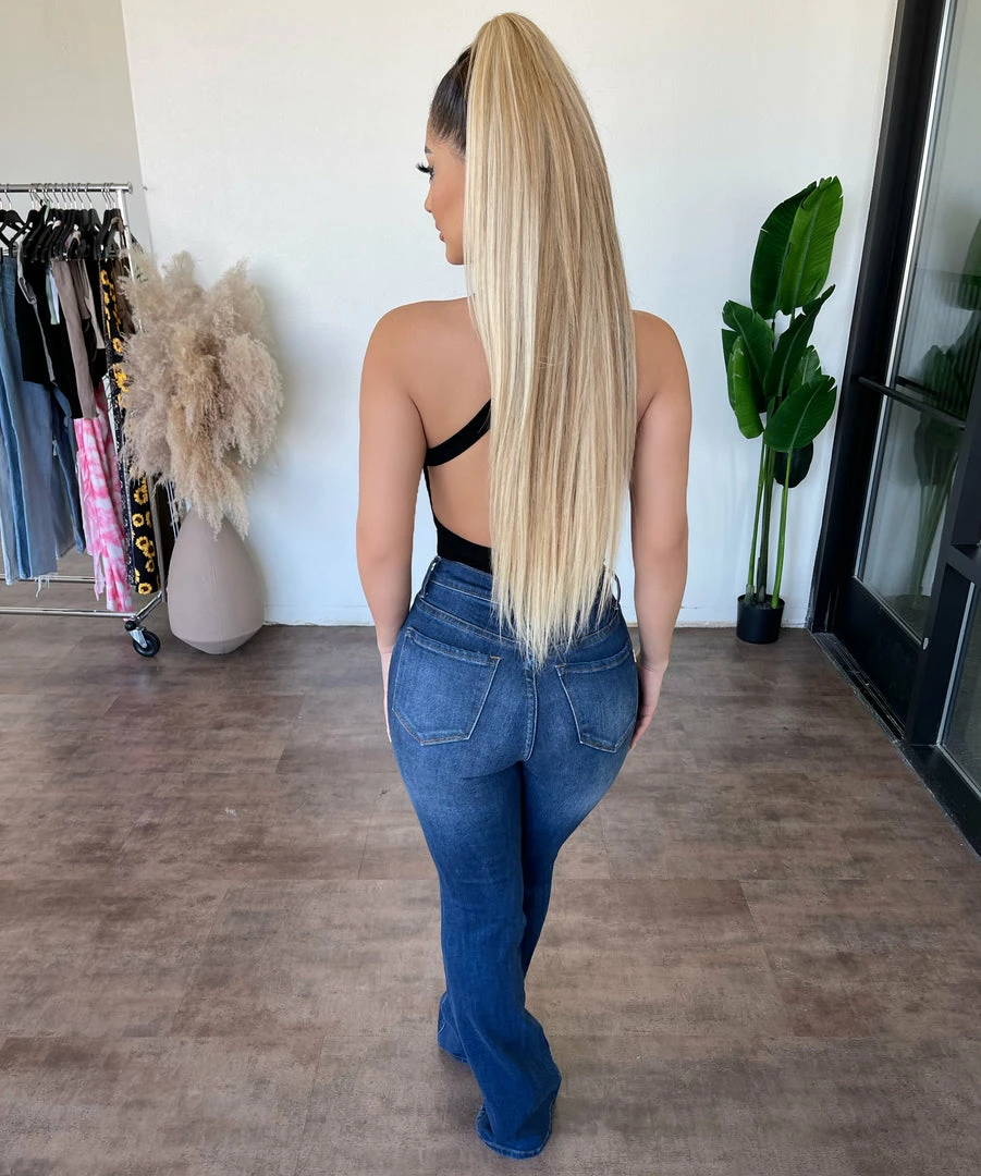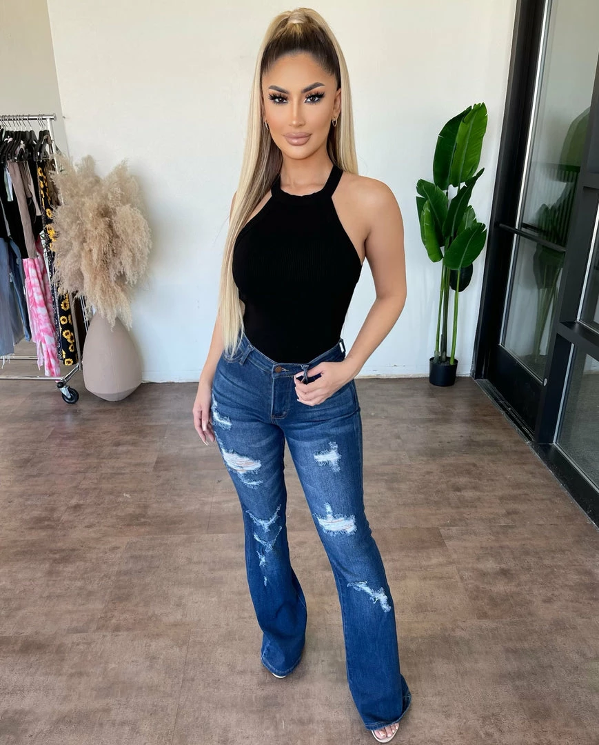 ~Pants made from nice fitted material with flare detail towards bottom of jeans, Jeans have front distressed detail and great for many occasions