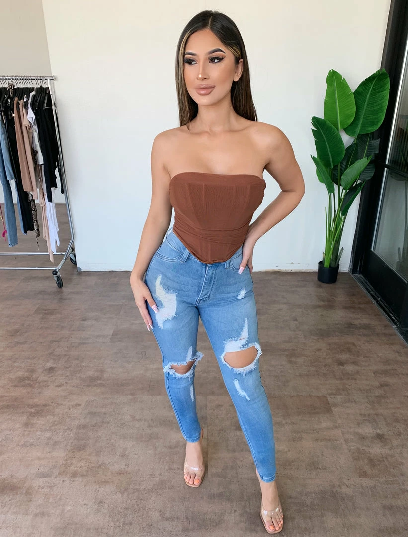 ~High rise jeans made from nice stretchy fitted material with distressed detail on front of jeans, Jeans are perfect with a cami top or bodysuit