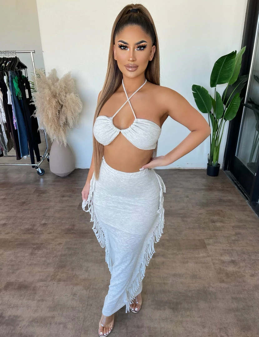 ~Set made from knit fitted material with halter top and skirt for bottoms, Set goes great with heels or sandals and perfect for a nice night outÂ