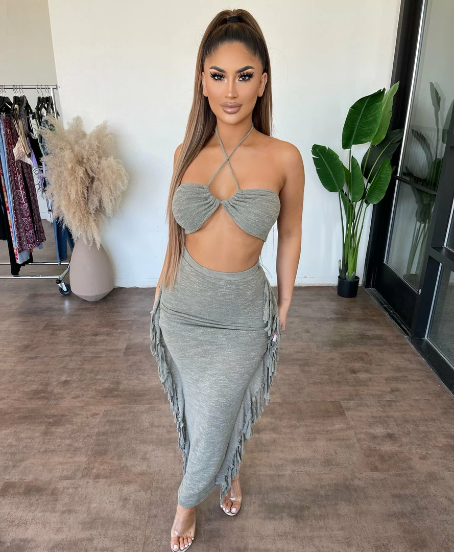~Set made from knit fitted material with halter top and skirt for bottoms, Set goes great with heels or sandals and perfect for a nice night outÂ